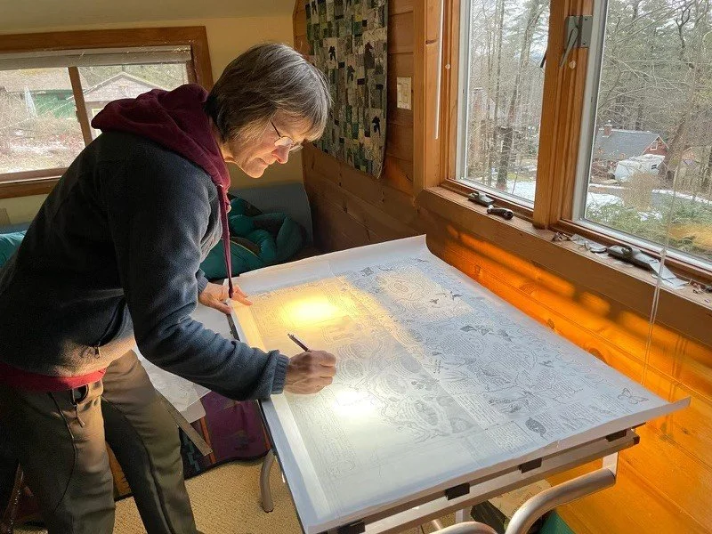 Marcy Marchello is an Ann Arbor native, residing in Massachusetts, specializing in hand drawn maps as a celebration and study of natural places. A graphic artist since childhood, with a degree in Environmental Education, Marcy values hand-created art, nature observation, and exploring the outdoors. Helping others deepen their understanding of and appreciation for nature is a primary motivation for her art.