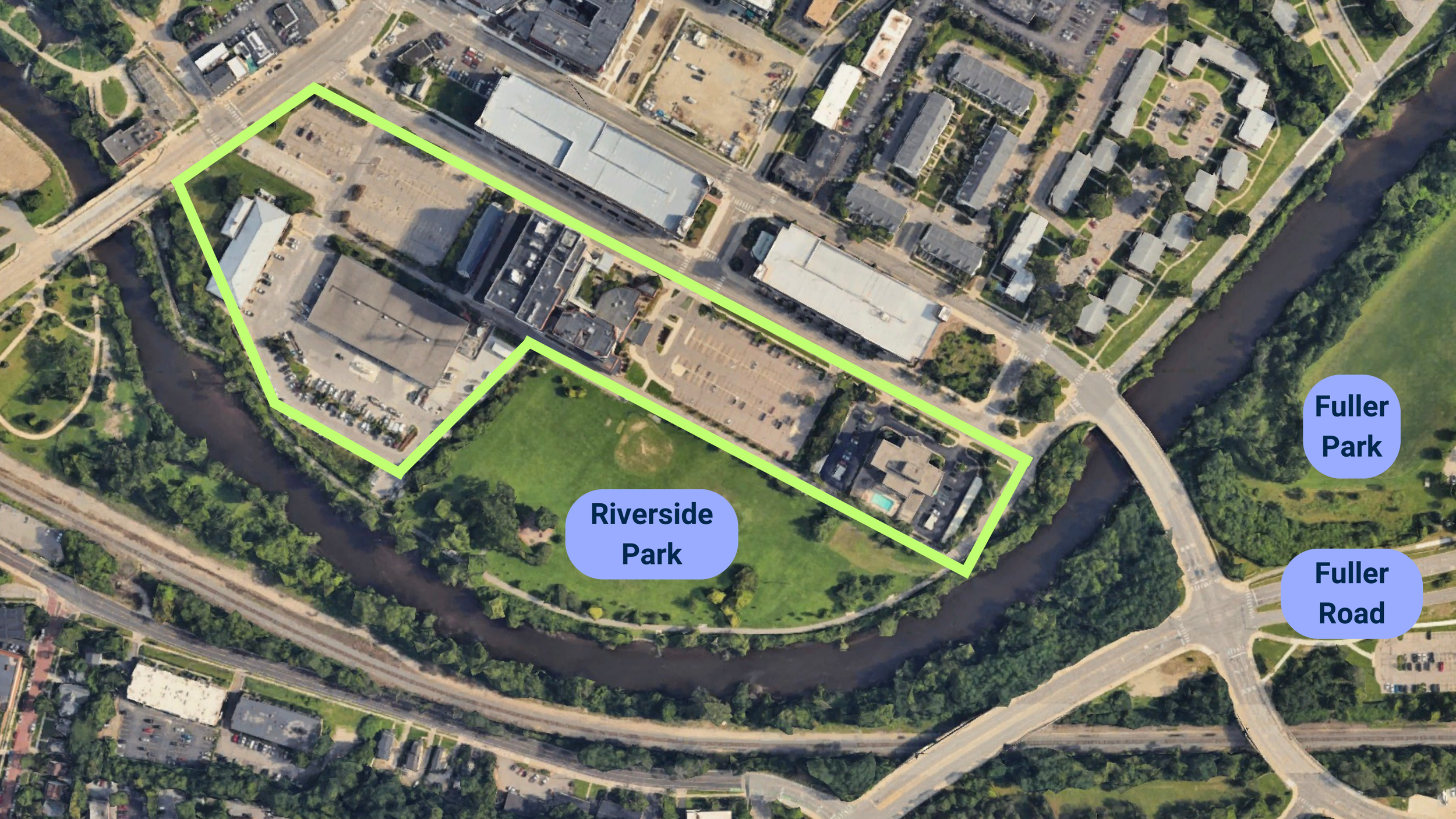 There are ideal sites in the river corridor along Fuller Road that could serve as mixed-use, mixed-income developments offering affordable, workforce, and market-rate housing while being only a short walk away from downtown, campus, park land, and the river.