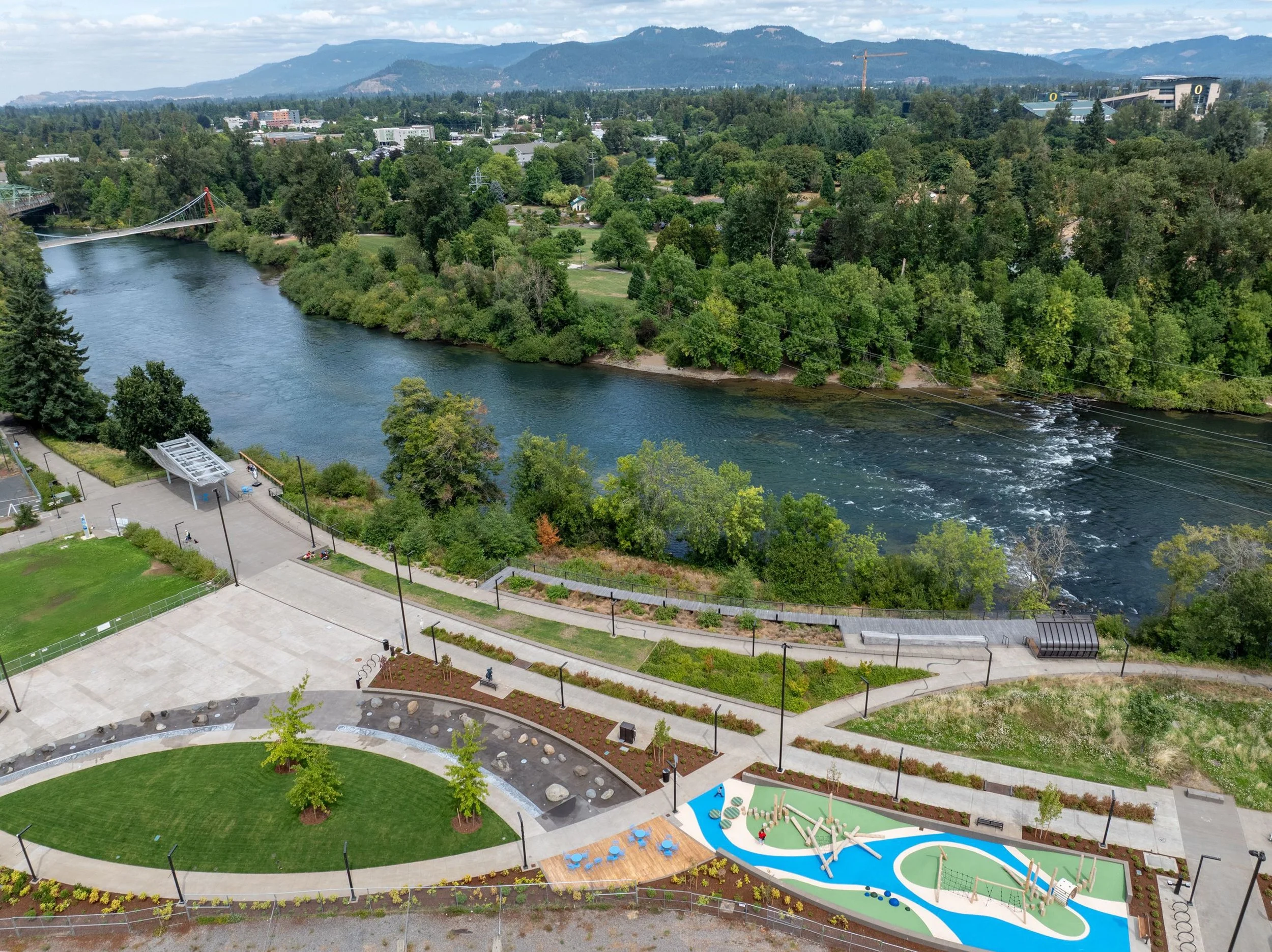 Eugene completed work on Riverfront Park in the summer of 2025, transforming an old utility operations yard along the river into a 3-acre park right on the waters edge. Complete with paved walking and biking trails, covered seating and overlooks of the river, and a 1-acre park plaza that, once further development is completed, will connect to multi-family housing and restaurants downtown. The design and features of the park had input from thousands of local community members, making it a true park for the people of Eugene.